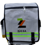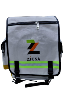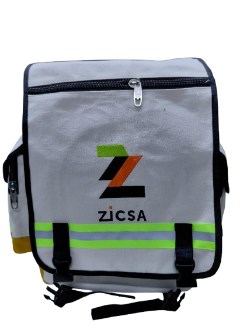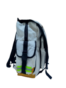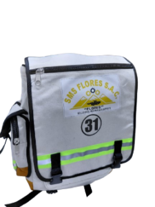 Mochila de lona cruda, con base de cuero hidrofugado (cuero tratado para mayor resistencia y durabilidad) de 3 divisiones 2 bolsillos laterales para equipos electrónicos, lleva cinta reflectiva para que pueda ser visible el usuario en interior mina, con logotipo bordado del cliente.